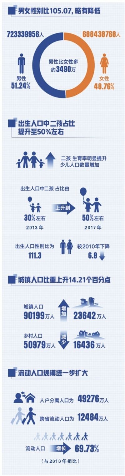 从性别结构看,男女比例持续改善。我国男性人口为72334万人,占51.24%;女性人口为68844万人,占48.76%。总人口性别比为105.07,与2010年基本持平,略有降低