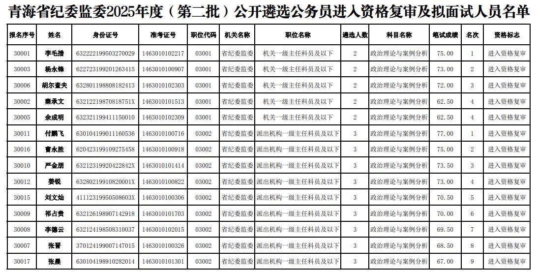 根据《青海省2025年度公开遴选和公开选调公务员工作实施方案》《青海省2025年度公开遴选和公开选调公务员公告》有关要求,现对省纪委监委2025年公开遴选公务员拟进入面试人员进行公示,并就资格复审、面试工作相关事宜通知如下: