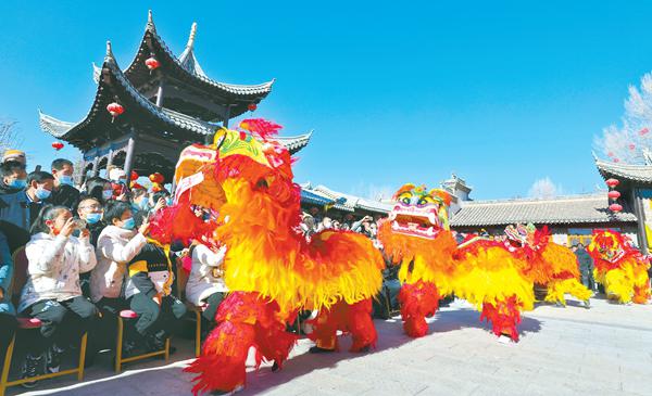 在甘肃省张掖市民乐县城北民俗文化村,民乐县民联镇舞狮队正在为群众表演舞狮节目。 (图片来源:视觉中国)
