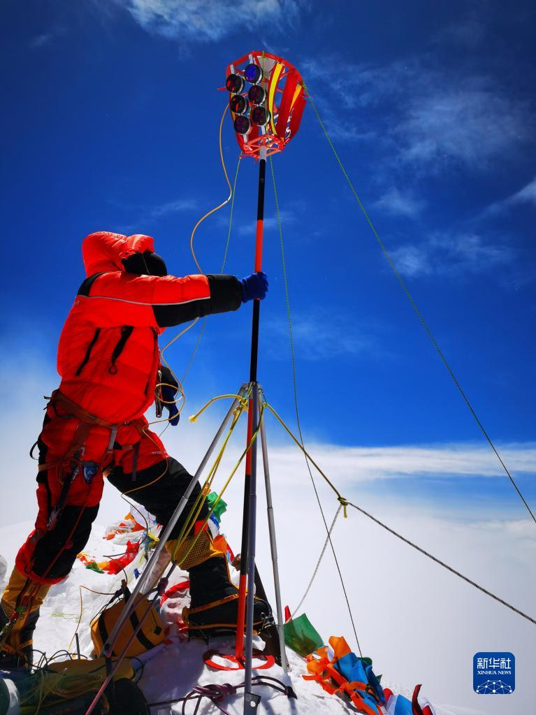 2020珠峰高程测量登山队队员在珠穆朗玛峰峰顶开展测量工作(2020年5月27日摄)。新华社特约记者 扎西次仁 摄 5G信号如何抵达世界之巅? 2020年4月,从海拔5200米的珠峰大本营出发,40名铺设组成员肩扛传输光缆,带着46头牦牛组成的运输队,在冰川山路跋涉,运送近8吨的建设物资,完成特种传输光缆铺设。 海拔6500米——4月30日下午,世界海拔最高的5G基站投入使用。加上此前在海拔5300米、5800米建成的基站,5G信号已实现对珠峰北坡登山路线及峰顶的覆盖。