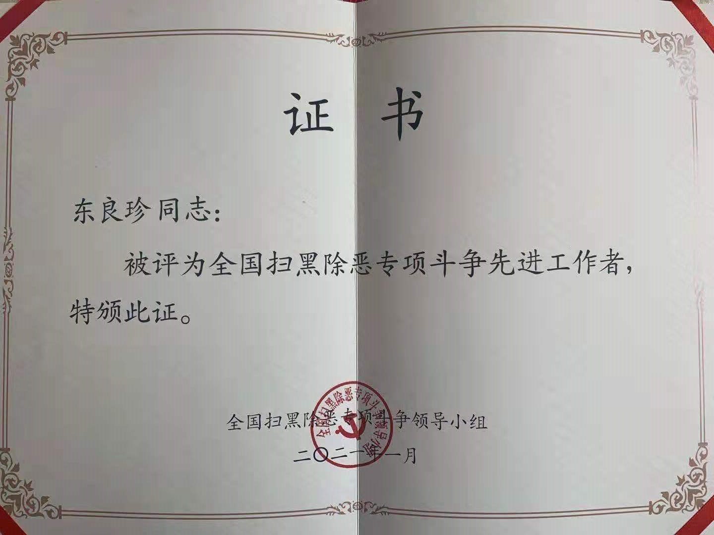 2021年3月,东良珍同志被评为“全国扫黑除恶专项斗争先进工作者”,受到习近平总书记等党和国家领导人的亲切接见,现场聆听了总书记的重要讲话。他始终牢记总书记的殷殷嘱托,倍加珍惜殊荣,把个人获得的10000元奖金作为爱心善款,捐献给了海西州红十字会,通过红十字会向困难家庭伸出援助之手,用实际行动践行点滴为民的庄严承诺。